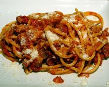 Per 4 persone: 500 gr. di bucatini, 4-5 fettine di cipolla, 8 cucchiai di olio extravergine, 100 gr. di guanciale o pancetta a cubetti, 2 barattoli di polpa di pomodoro pronta (meglio se preparata con i pomodorini, puliti, lavati, sbollentati, pelati, privati dei semi e passati al tritatutto), 4 cucchiai di parmigiano grattugiato misto a pecorino, vino bianco, due cucchiaini di aceto, peperoncino piccante e sale q.b.