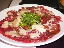 Per 6 persone: 400 gr. di fettine sottilissime di filetto o di noce di vitella, il succo di 2 limoni spremuti, 3 cucchiai di olio extravergine, 2 mazzetti di rucola pulita, lavata e tagliuzzata con le forbici, 150 gr. di scagliette di parmigiano, sale q.b.