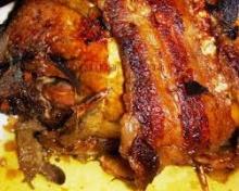 Per 8 persone: una faraona perfettamente pulita e disossata, 300 gr. di mascarpone, 1 bicchierino di brandy, 300 gr. di mortadella (fetta unica tagliata a dadini), 300 gr. di petto di pollo tagliato a dadini, 2 cucchiai di panna liquida, 1 uovo, 2 cucchiai di parmigiano, 60 gr. di gherigli di noce, 1 cucchiaio di prezzemolo tritato, 6 cucchiai di olio extravergine, vino bianco, 2 cucchiai di burro, 6 fettine di pancetta arrotolata, una spolverata di farina, brodo di dado di carne, pepe e sale q.b.