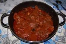 Per 4 persone: 600 gr. di fettine di vitellone molto tenero affettato sottile, 1 spicchio di aglio, 6 cucchiai di olio extravergine, una spolverata di origano, 1 barattolo di polpa pronta, sale q.b.