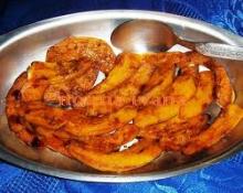 Per 4 persone: 1kg. di zucca tagliata a bastoncini spessi 1 cm., 8 pomodorini, 2 fettine di cipolla, 1 lit di olio di semi di arachidi, un pizzico di paprika, di pepe macinato e di noce moscata, peperoncino e sale q.b.