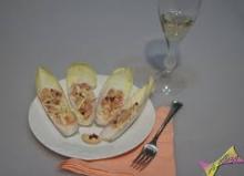 Per 6 persone: 2 cespi di indivia belga, 350 gr. di polpa pulita di pescatrice o branzino, 350 gr. di salmone fresco, 2 limoni, cipolla, zenzero, erba cipollina, olio extravergine di oliva, pepe in grani, sale q.b., 2 cucchiai colmi di rucola lavata asciugata e tritata finemente.