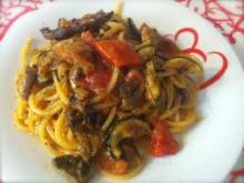 Per 4 persone: 400 gr. di mezze maniche o sedani rigati, 1 melanzana, 1 zucchina grande, 1/2 peperone rosso, una carota, una costina di sedano tutto tagliato a dadini, 1 barattolo di polpa pronta, 8 cucchiai di olio extravergine, olio di semi per friggere, aglio, cipolla, pepe e sale q.b.