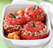 Per 6 persone: 10 pomodori rossi, grandi, sodi ma maturi, 18 cucchiai di riso, l’interno del pomodoro svuotato, poca polpa pronta di pomodoro, 10 cucchiai di olio, 1 spicchio di aglio, 1 cucchiaio di prezzemolo tritato, qualche fogliolina di basilico, una spolveratina di origano, pepe e sale q.b.
