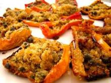 Per 6 persone: 6 pomodori rossi e maturi ma sodi, 4 peperoni rossi grandi, 1/2 peperone verde tagliato a listarelle, una ventina di cucchiai di pangrattato, 1 spicchio di aglio grattugiato, 2 cucchiai di prezzemolo tritato, 3 cucchiai di sottaceti tagliati piccoli, 10 cucchiai di olio extravergine, un accenno di aceto, pepe, sale q.b..