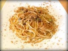 Per 4 persone: 400 gr. di spaghetti, 150 gr. di olive di Grecia snocciolate e tagliate a rondelle, 4 cucchiai di capperetti sottaceto sciacquati e strizzati, un cucchiaino di pasta d’ acciughe, 4 cucchiai di pangrattato fatto dorare in un padellino antiaderente senza che bruci, 8 cucchiai di olio extravergine, 2 spicchi d’aglio tagliati a metà, peperoncino e sale q.b.
