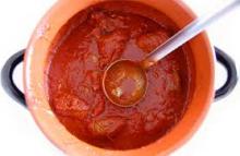 Per 6 persone: 8 fettine di vitellone affettate sottili, 1 spicchietto di aglio grattugiato, 1 cucchiaio di prezzemolo tritato finemente, 25 cucchiai di olio extravergine, 2 bottiglie di passata di pomodoro, 1/2 cipolla affettata, una carota affettata sottilissima, una costina di sedano tagliata a dadini, vino bianco, sale q.b.
