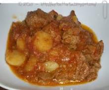 Per 6 persone: 800 gr. di spezzatino di vitella, 12 cucchiai di olio extravergine, 6 patate grandi sbucciate, lavate e tagliate a tocchi, una cipolla piccola affettata sottilmente, brodo di dado di carne, vino bianco, 1/2 bicchiere di passata di pomodoro, sale e pepe q.b.
