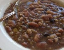 Per 4 persone: 500 gr. di fagioli zolfini secchi tenuti a mollo per una notte e poi lessati o 3 barattoli di fagioli cannellini precotti, super sciacquati, sbollentati per una diecina di minuti e ben colati, 60 gr. di pancetta, 6 cubetti di spinaci surgelati, 250 gr. di bieta pulita e lavata, 300 gr. di cavolo nero affettato sottilmente (se non si riesce a trovare il cavolo nero, prettamente toscano, usare il cavolo verde), mezza cipolla affettata sottilmente, una costa di sedano a dadini, una carota tagliata a rondelle, 10 cucchiai di olio extravergine, 4 fette di pane toscano o comunque di un buon pane casareccio compatto, un dado da brodo vegetale, pomodoro q.b. per rendere rosata la minestra, pepe e sale q.b. (senza la pancetta si ottiene anche un ottimo piatto vegetariano).