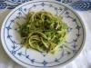 LINGUINE AL PESTO DI ZUCCHINE Per 4 persone: 400 gr. di linguine, 400 gr. di zucchine, 1 cucchiaio di prezzemolo tritato, 20 foglioline di menta, 1/2 spicchio di aglio, 70 gr. di parmigiano grattugiato, 40 gr. di mandorle, sfilettate e tostate, 8 cucchiai di olio extravergine, pepe e sale q.b.
