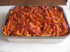 PASTA AL FORNO CON MELANZANE Per 6 persone: 600 gr. di penne lisce, 10 melanzane tagliate per lungo e fritte, come indicato nella ricetta “parmigiana di melanzane”, 1 fior di latte (circa 300 gr.) più un ovolo di fior di latte (circa 130 gr.), 120 gr. di parmigiano grattugiato, 6 fettine di cipolla, olio per friggere, 3 barattoli di polpa pronta, poca panna per cucina, 10 foglioline di basilico, sale q.b.