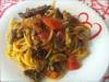 PASTA AL RAGU’ DI VERDURE Per 4 persone: 400 gr. di mezze maniche o sedani rigati, 1 melanzana, 1 zucchina grande, 1/2 peperone rosso, una carota, una costina di sedano tutto tagliato a dadini, 1 barattolo di polpa pronta, 8 cucchiai di olio extravergine, olio di semi per friggere, aglio, cipolla, pepe e sale q.b.