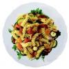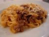 PASTA ALLA CRONWELL Per 6 persone: 1/2 kg. di fettuccine, 3 salsicce, 1 peperone fresco a listarelle, 1/4 di cipolla affettata sottile, 1 spicchio d'aglio tagliato a metà, una bustina di funghi secchi ammorbiditi in acqua bollente per 20 minuti, 3 barattoli di polpa di pomodoro, 8 cucchiai di olio extravergine, peperoncino e sale q.b.